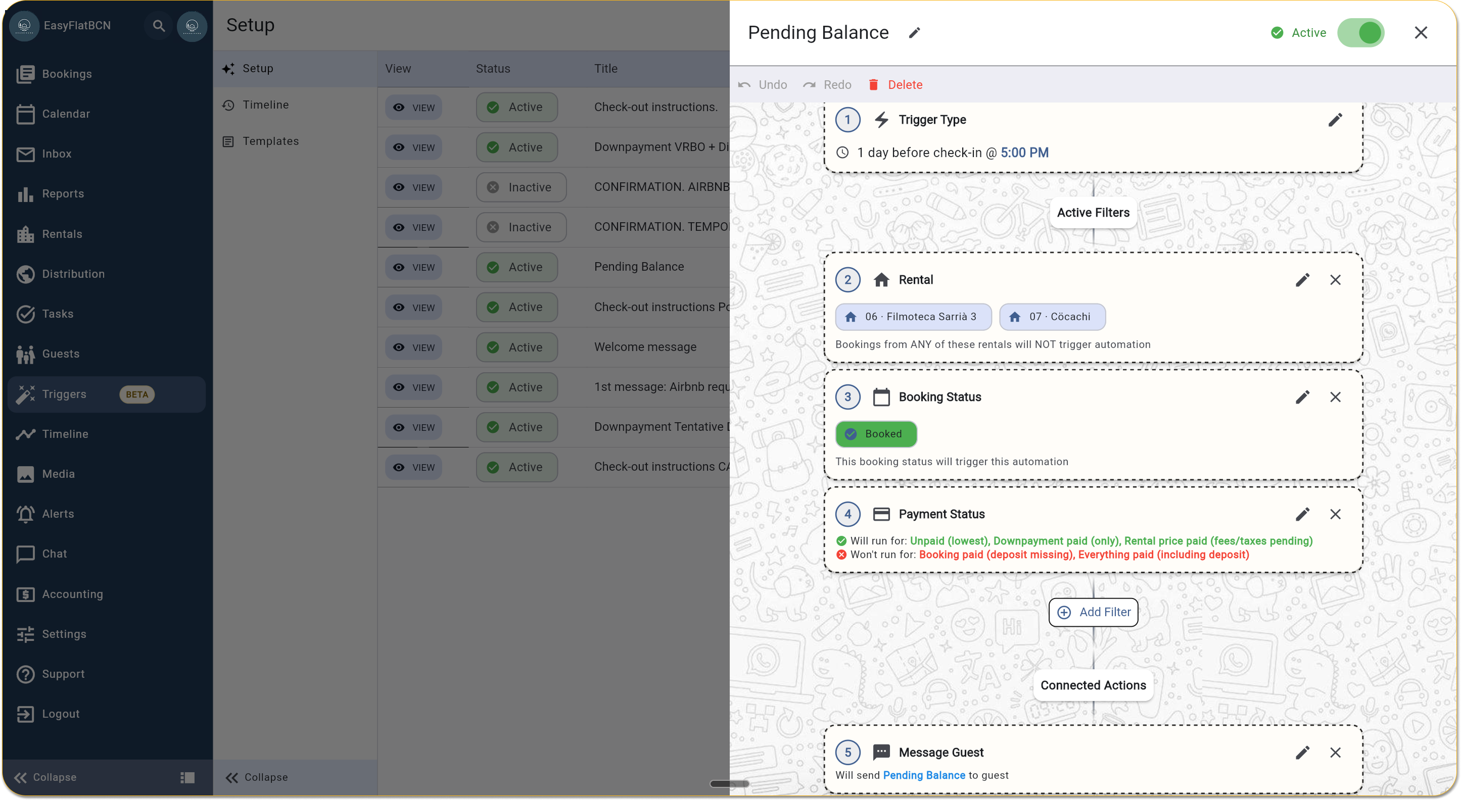 You can combine multiple filters to create very specific conditions. The effectiveness of combining filters allows you to create rules such as: "Send a welcome email 3 days before check-in, ONLY for bookings with 'Booked' status, coming from Airbnb and tagged as 'New Guest'." This level of detail minimizes errors and maximizes relevance.